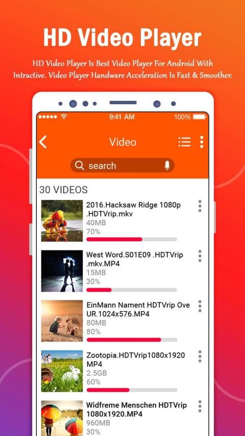 adalah pemutar multimedia gratis untuk Android. Sekarang Anda dapat menonton semua format video populer di ponsel Anda dengan akselerasi perangkat keras untuk pemutaran HD yang lebih cepat dan lebih lancar dengan kemudahan dan kenyamanan yang tak tertandingi. Pemutar video HD mendukung semua format video populer, termasuk AVI, 3GP, MKV, TS, MPG, M4V, MOV, MP4, WMV, RMVB, FLV, dll.