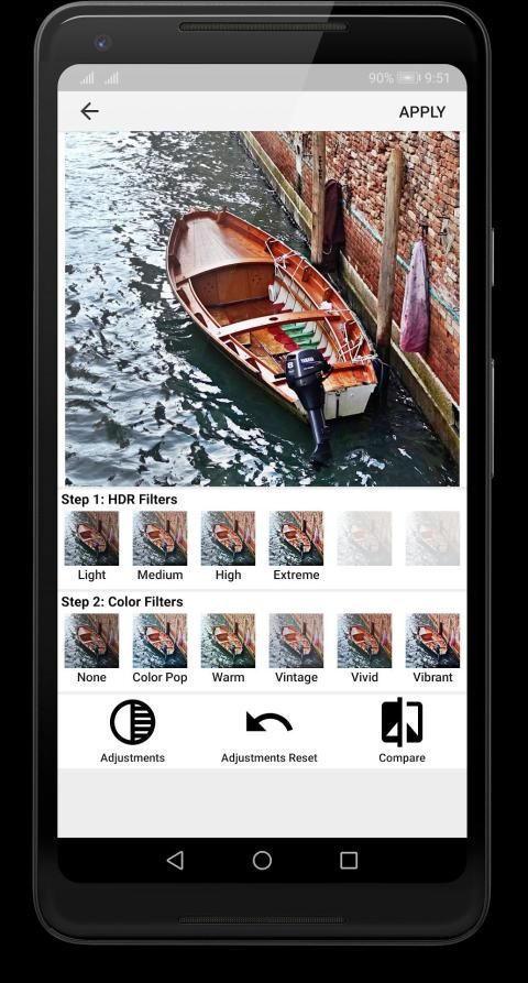 Filter HDR cerdas yang dapat menghasilkan efek HDR dengan menggunakan satu foto saja. Aplikasi ini memiliki 4 efek HDR yang berbeda, mulai dari efek cahaya, yang dapat digunakan untuk mengoreksi rentang dinamis foto, hingga efek ekstrem, yang menghasilkan efek HDR dramatis. Setiap filter memiliki slider kekuatan filter yang dapat disesuaikan yang mengontrol intensitas filter.