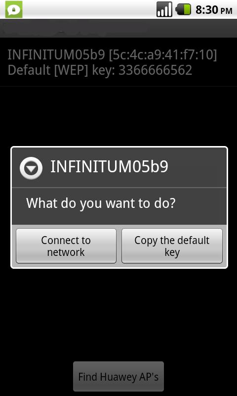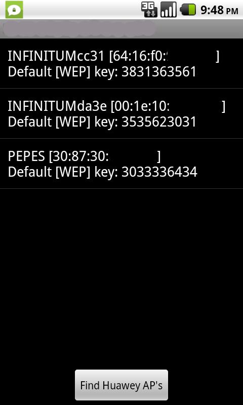 HHG5XX default WEP key scanner is an Android application for penetration testers to audit wireless networks to check against default key authentication in Huawei HG5XX access points. It generates the default keys of all the access points found using Huawei's mac2wepkey algorithm.Features:-Export results to SD Card.-Automatic configuration of the wireless networks in your known connections.-It's a passive scan. It generates the key using the mac address broadcasted by the access point.DEMO:http://www.youtube.com/watch?v=ocuf7oVJnIkIn the extremely rare case of a Huawei HG5XX device not being detected by the scanner, please send me its mac address to add it to the list.If you find this app useful please rate it and consider buying the version with no ads to support the development of more penetration testing apps.Remember, everytime you leave a 1 star comment with no feedback God kills a kitten.This app only support Huawei routers, do not give me a bad rating because it did not generate the correct key for your random wifi network.Recent changes:-Added more mac address rangesContent rating: Low Maturity
