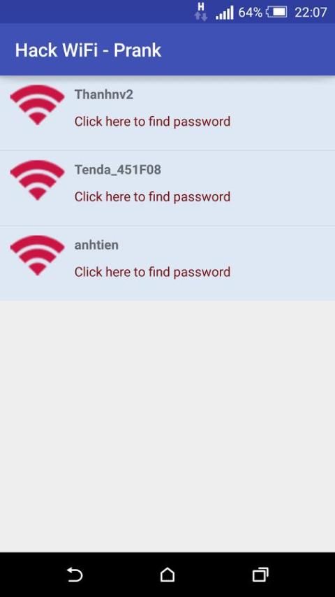 When open Hack WiFi - Prank app, It will show you all available wifi networks in range