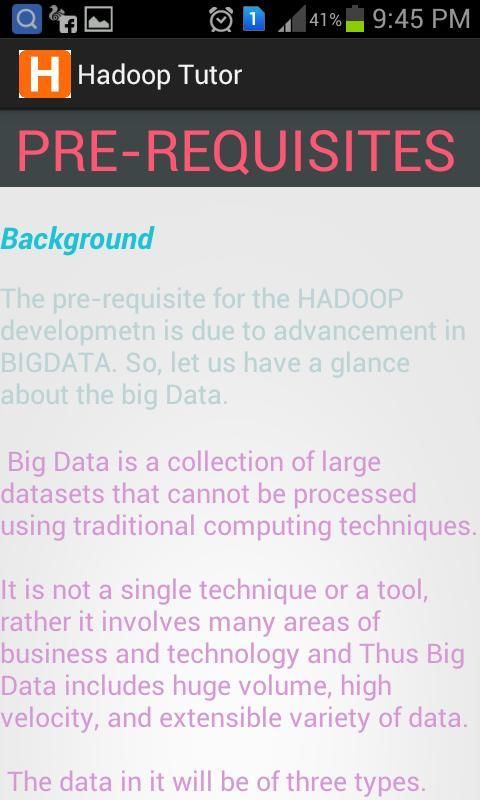 Hadoop Tutor,an app that provides a Quick view and not only the basic fundamentals but also providing a n in-depth view of the hadoop framework.The app provides a brief overview of the installation and environment of how it works.