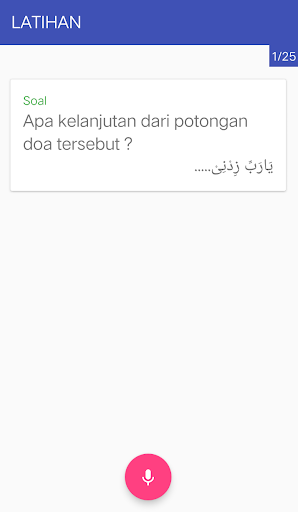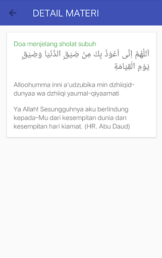 aplikasi ini menyajikan menu materi yang terdiri dari doa-doa pilihan kemudian aplikasi ini dilengkapi dengan latihan menjawab potongan doa menggunakan speech recognition yang diharapkan bisa menarik minat menghafal doa-doa