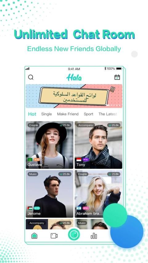 Hala akan menghilangkan kehidupan jemu Anda dan membuatnya menarik dengan membantu Anda mengobrol dan bertemu teman baru dari seluruh dunia. Kapan saja dan di mana saja Anda dapat terhubung dengan orang lain dan itu adalah cara yang baik untuk berkomunikasi dengan orang-orang yang berbudaya berbeda dan mengenal ide-ide mereka tentang kehidupan, negara, kebiasaan dan hobi. Mengobrol dengan orang dan menjadikan waktu Anda berharga. Anda akan mendapatkan beberapa keterampilan dan pengetahuan dari satu sama lain. Jangan menunggu - Bergabunglah dengan Hala, tayangkan hidup Anda, dapatkan banyak penggemar, terima hadiah, dapatkan uang, dan jadilah idola dengan mudah.