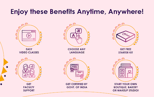 Kursus keterampilan online adalah komunitas yang terdiri dari 30 lakh wanita dari 28 negara bagian di India.Sejauh ini, 40.000 wanita telah belajar banyak keterampilan bersertifikat dalam bahasa mereka dengan kelas video yang mudah dari aplikasi Hunar!Tidak hanya ini, Hunar juga telah membantu lebih dari 10.000 wanita untuk memulai bisnis mereka, menjadi independen finansial dan mendapatkan ketenaran nasional.