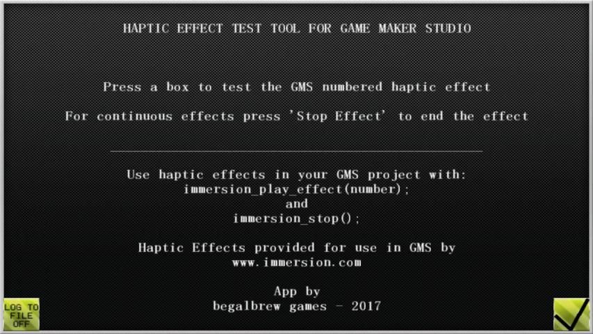 Aplikasi ini tidak menyimpan file log timestamped untuk setiap sesi yang menyimpan informasi rinci tentang setiap haptic Anda menguji, dan ketika efek berkelanjutan dihentikan.