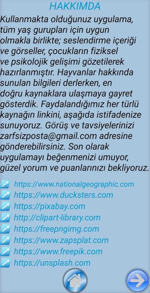 İncelemekte olduğunuz uygulamada, hayvanların gerçek resimlerinin yanı sıra, karikatür resimlerine de yer verilmiştir. Hayvanların gerçek sesleri ile beraber özelliklerini de dinleyebilirsiniz. Uygulama, tüm yaş gurupları için uygun olmakla birlikte; seslendirme içeriği ve görseller, çocukların fiziksel ve psikolojik gelişimi gözetilerek hazırlanmıştır. Hayvanlar hakkında sunulan bilgileri derlerken, en doğru kaynaklara ulaşmaya gayret gösterdik. Ayrıca faydalandığımız her türlü kaynağı aşağıda belirtmeye çalıştık. Öneri görüş ve tavsiyelerinizi zarfsizposta@gmail.com adresine gönderebilirsiniz. Son olarak uygulamayı beğenmenizi umuyor, güzel yorum ve puanlarınızı bekliyoruz.