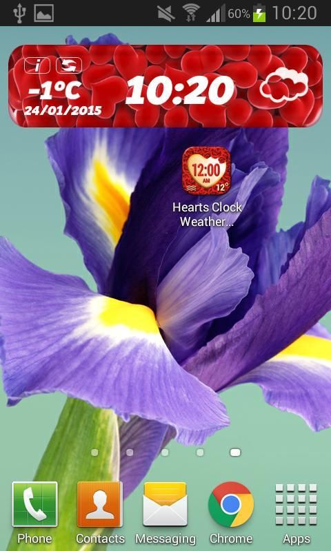 Widget jam ini memberikan tampilan yang besar dengan jam dan menit hari. Pilih salah satu jam dan menghias ponsel Anda. Mereka memiliki banyak berbagai ukuran dan bentuk, warna dan desain. Widget gratis ini menawarkan jam persegi, jam poligon, lingkaran jam dan jam lebih dari berbagai ukuran dan bentuk. Anda tidak harus menonton saluran cuaca lagi. Dapatkan widget ini lucu dan Anda akan tahu apa cuaca seperti di luar. Hanya memilih lokasi dan Anda akan melihat cuaca lokal di layar Anda. Download ♥ Hati Widget Cuaca Jam ♥ untuk ponsel Samsung Galaxy baru Anda.