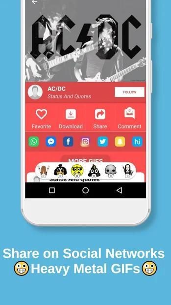 Heavy Metal GIFs App adalah aplikasi Android Full dengan desain material yang indah, fitur Powerfull memungkinkan Anda untuk memposting status Anda Gif Logam Berat pada aplikasi dan berbagi status pengguna lain sebagai teks atau sebagai Gif dengan Teman Anda di Jaringan Sosial apa pun yang Anda inginkan, tulis komentar, tambahkan Reaksi Anda tentang Status apa pun, tambahkan Status di daftar favorit Anda, kirim pemberitahuan ke perangkat android dan banyak lagi.