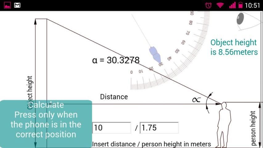 Gunakan alat ini (clinometer) untuk mengukur ketinggian benda, bangunan, tiang, pohon ... Anda hanya perlu tahu tinggi dan jarak ke objek