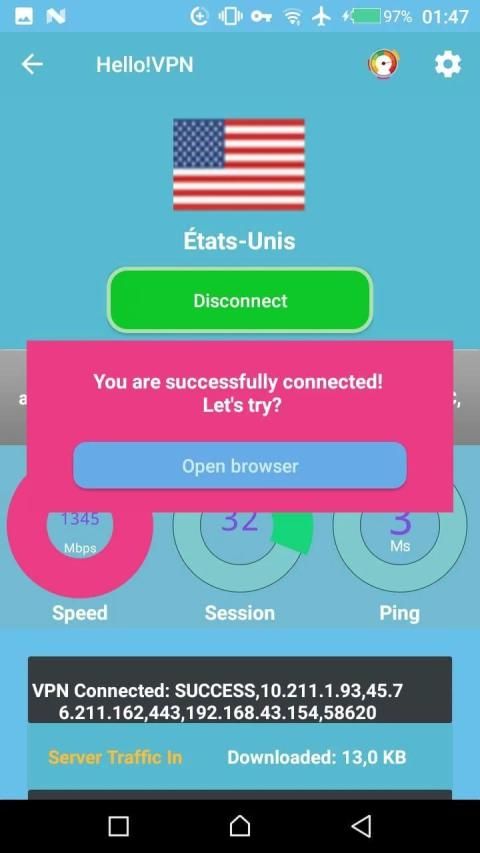 Hello! VPN mudah digunakan, hanya satu sentuhan untuk terhubung. Tidak perlu konfigurasi apa pun.