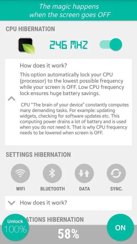 Your Android Phone / Tablet is designed to work all the time, even when you don't use them. Hibernate My Android App saves battery when the device is not in use. It works when the screen goes off, it hibernates CPU (Processor), Settings and Apps to save battery consumption.