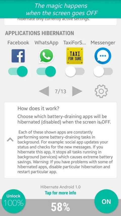Choose which battery-draining apps will be disabled (hibernated) when the screen is OFF.
