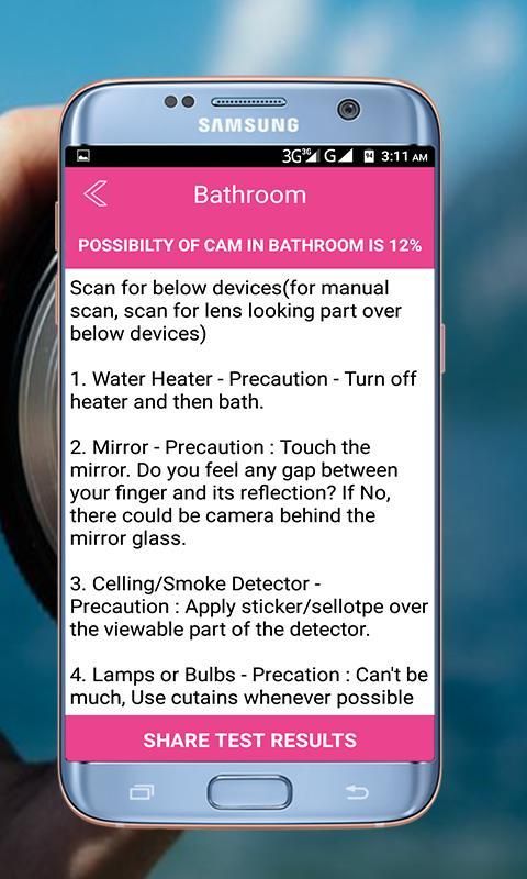 Buka HIDDEN CAMERA DETECTOR X dan Move Dekat dengan Spy camra mis Kamar mandi dan bedrrom ruang ganti, dll memiliki rahasia