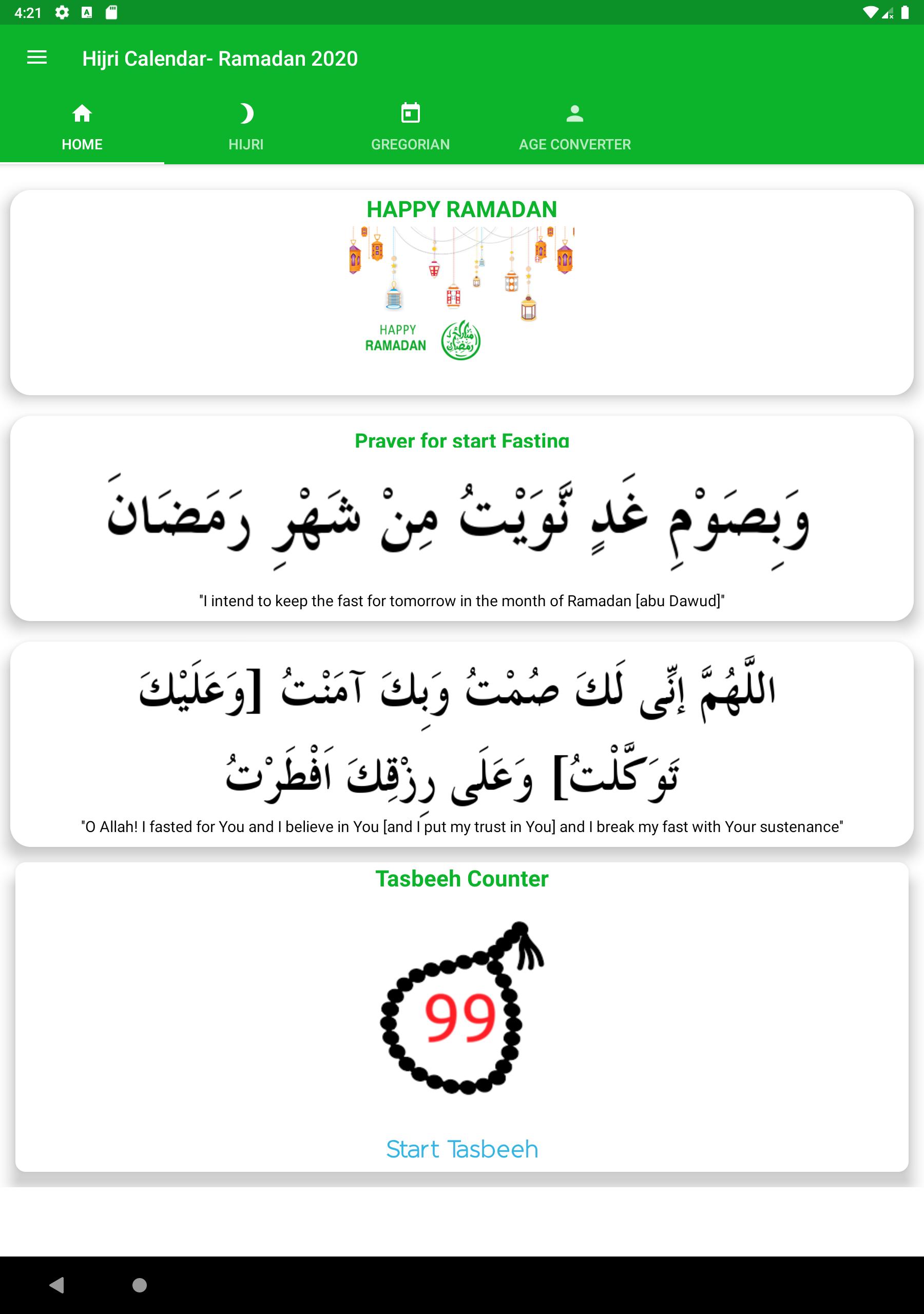 Hijri islamic calendar gives you exclusive features of Ramadan like duas/prayers for fasting and tasbeeh counter for zikar.