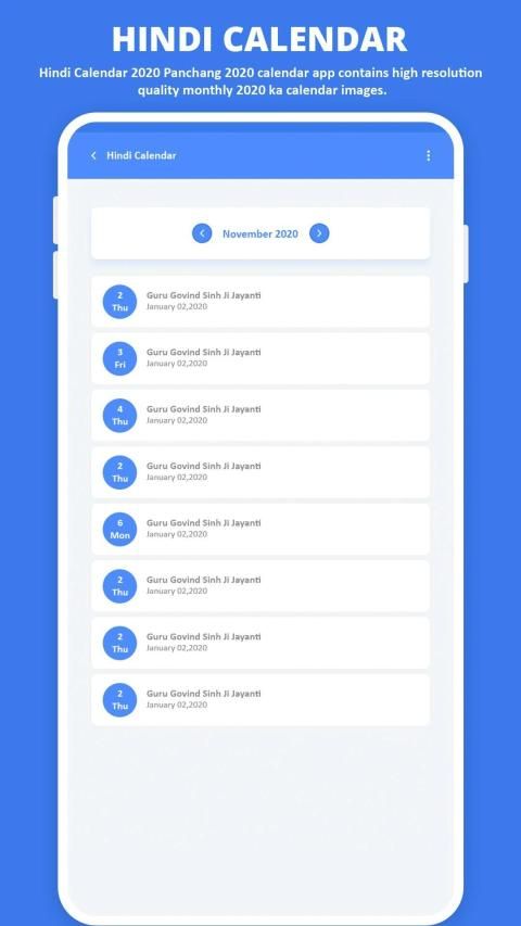 Kalender Hindi 2020 adalah kalender offline dan aplikasi kalender gratis untuk semua orang berbahasa Hindi di seluruh dunia. Aplikasi kalender Hindi sangat berguna untuk mengetahui festival, liburan, informasi Shubh Muhurat & Hindi panchang 2020