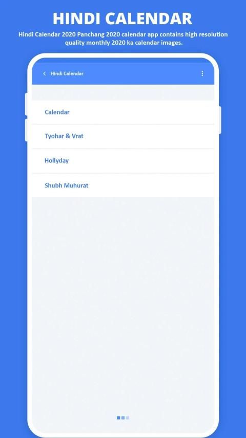 Aplikasi Kalender Hindi 2020 membantu mendapatkan hari keberuntungan untuk kalender tahun 2020. Seperti sebagai Giraha pravesh muhurat, Giraha aramv muhurat, Vahan muhurat, Mundan muhurat, Subha muhurat, Nama Karana muhurat untuk tahun kalender 2020