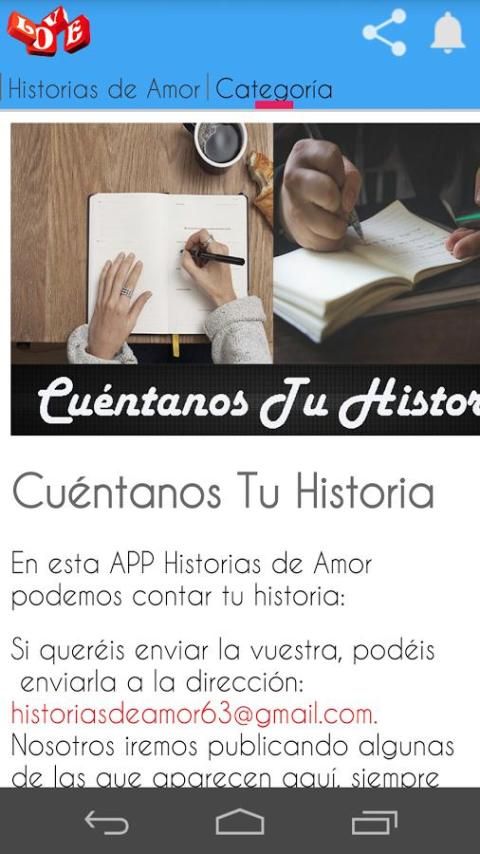 Kami juga memiliki bagian memberitahu kami cerita Anda, Anda akan melihat informasi tentang bagaimana Anda dapat mengirim cerita Anda sendiri cinta, dan dengan demikian dapat muncul di app.