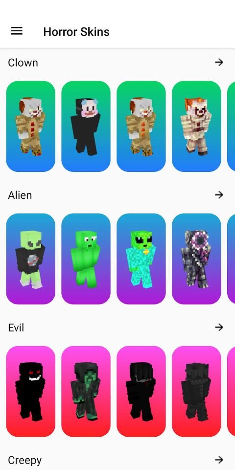 The Horror skins for Minecraft Pocket Edition app is very convenient to use, and it has a beautiful and intuitive interface. All skins are divided into categories, which makes navigation in the app simple. All skins are of high quality (HD skins) and they look cool. The app has a preview of the skin (3D preview). You can view the skin from all sides right in the app! You can set the skin immediately into the game with the click of a button! Or download it to the gallery and use it from there. You can share your favorite Horror skins with your friends. Tell them about this app so they will also have popular, new skins.
