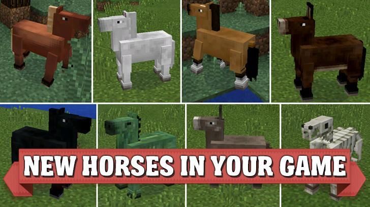 The Horses Mod untuk Minecraft PE menambahkan 10 jenis kuda. Kuda-kuda untuk mcpe bisa dijinakkan dan digunakan untuk naik. Semua dari mereka akan menelurkan secara acak di dunia Anda, tetapi Anda juga dapat menggunakan telur bibit untuk bertelur mereka dalam mod ini untuk minecraft pe. Sebuah fitur yang besar adalah bahwa kuda minecraft mods akan menyimpan dalam dunia Anda setelah keluar itu.