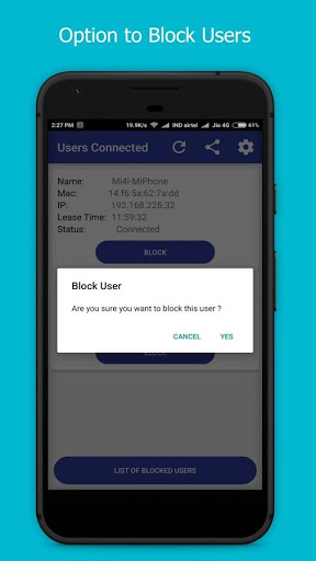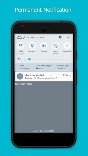Hotspot Manager for Jiofi' Displays Detailed Information Including Battery Percentage and List of Users Connected to the JioFi Hotspot. Users can also change password and network SSID easily with the click of a button. There is also an option to block any user from connecting to the hotspot. A permanent notification is also shown at the status bar which indicates the battery and users connected.