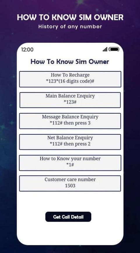 How to Get Call Details application helps the Indian prepaid telecom users to find the numbers for specific operations like Recharge, Main, Message, Net Balance enquiry, Finding own number and Customer care number. This How to Find Sim Owner Details App will help to find out the USSD Mobile Codes for All Mobile operators in India. You can get all types of USSD Mobile codes like Balance, 4G Data balance, Complaints, Customer Care, 3G Balance, 2G Balance, Special Offers, etc.
