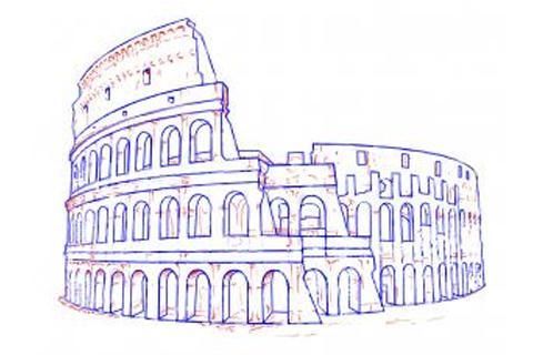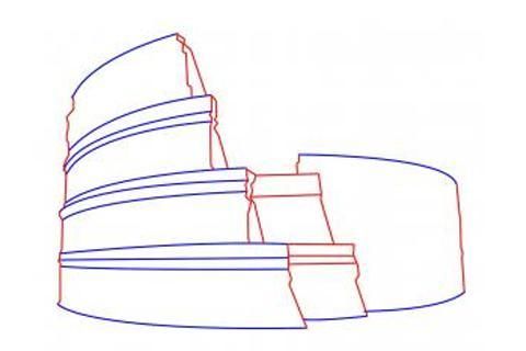 Langkah 2. Bentuk bentuk keseluruhan dari Colosseum adalah bahwa silinder. Periksa referensi Anda. Apa yang ingin Anda lakukan di sini adalah berbaring beberapa garis lengkung yang mewakili setiap tingkat struktur. Pada cetak biru, ini akan menjadi lurus, garis horizontal. Dalam perspektif, meskipun, garis menjadi melengkung. Anggap saja seperti tali melilit cat kaleng.