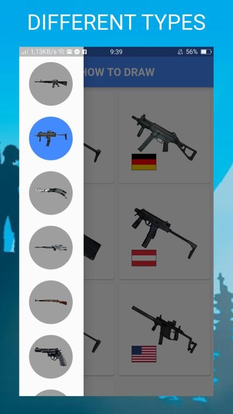 How To Draw Guns app composes of a lot of cute cartoon drawings weapons , like draw draw assault rifles,draw sniper rifles, draw rifles, draw cold weapons, draw knives,draw swords...