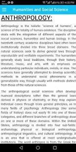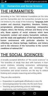 Humanities are academic discipline that study aspects of human society and culture. social sciences in which include all economics related subjects such as ethics, humanities and history. In this app we learn just humanities and social sciences and also the importance of social sciences because social sciences provides coordinated, systemic study drawing upon such disciplines as Anthropology, Archaeology, Economics, Geography, history, jurisprudence, philosophy, political science, psychology, religion, and sociology, as well as appropriate content from the humanities, mathematics, and natural sciences.