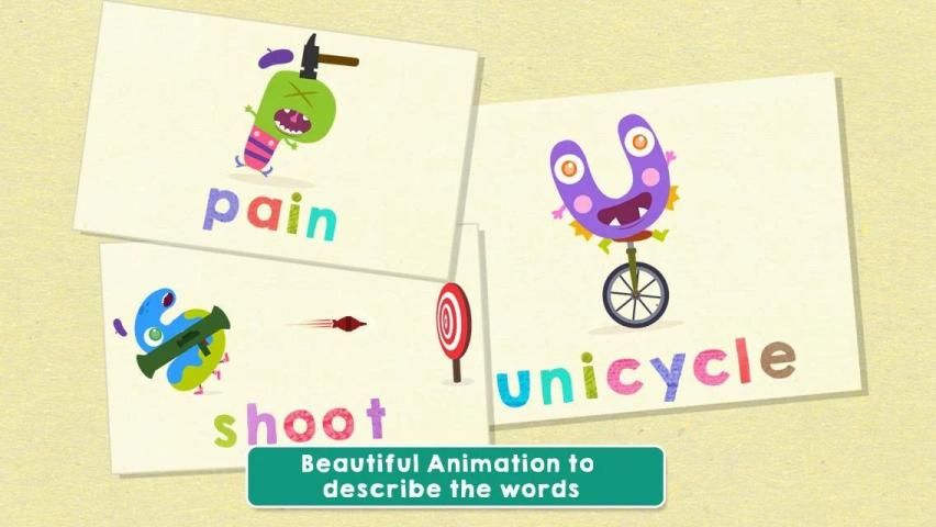 Pakan rakasa Anda kata dengan benar dan Anda akan dihargai dengan urutan animasi lucu yang juga jelas menjelaskan maknanya. sulih suara mengajarkan pengucapan dan relevansi kata, bila digunakan dalam kalimat.
