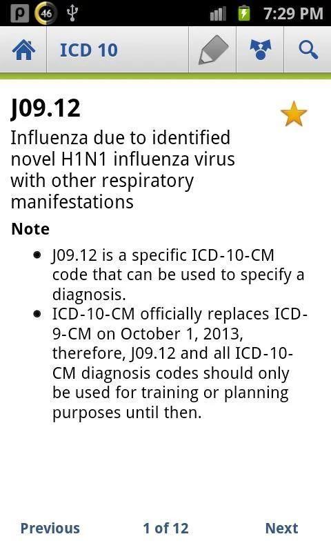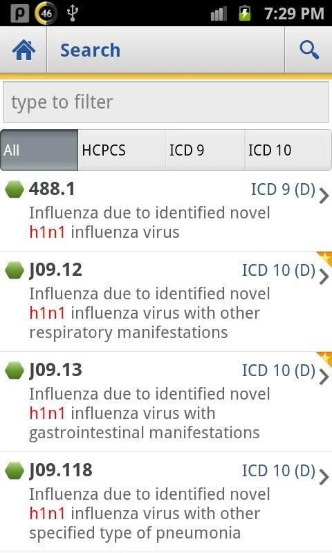 The 2011 I codes are instantly searchable and also browsable by their traditional categories. Search by code or description, through the whole ICD10,ICD9 & HCPCS or through just a category or selected nonspecific code. Images within the list indicate whether a code is specific or nonspecific. Tap to view the diagnosis and the full text of its standard description and to add it to your Favorites list for immediate access later.