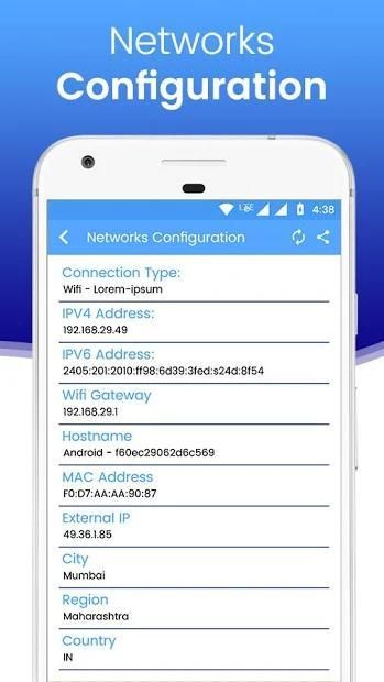 • IP information of this app includes WiFi Connection type, IPv4, WiFi gateway, Hostname, Host IP, External IP, City, Region and Country