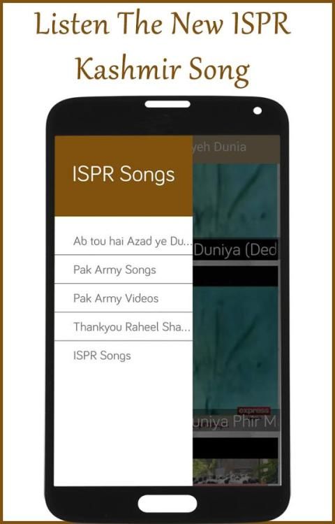 ISPR terkenal untuk merilis patriotik dan hati lagu pemanasan untuk Pakistan dan Kashmir People. Aplikasi ISPR Kashmir Lagu ini juga merupakan contoh di mana Anda dapat menemukan terbaru ISPR Lagu yang didedikasikan untuk Kashmir Orang yaitu Ab ke Hai Azad yeh Duniya, Phir Main Kioon Azaad Nahi. Lagu ini sangat sensitif dan sangat populer lagu kashmir.