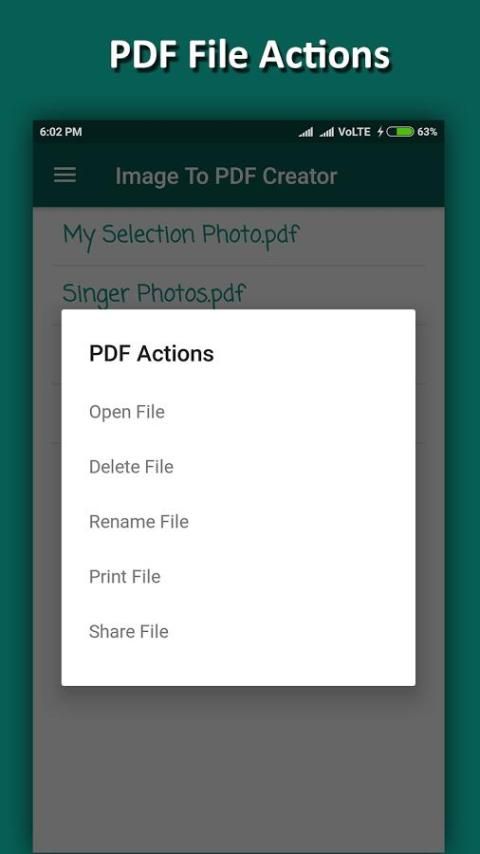 - Panjang Menekan File Untuk Tampilkan PDF Action "Open File", "Hapus File", "Ubah nama File", "Print File" Dan "Share File".