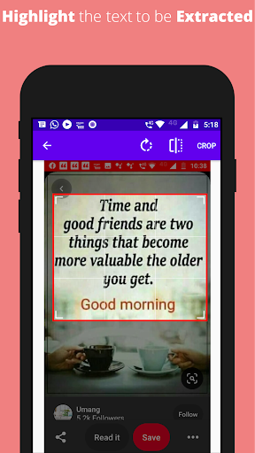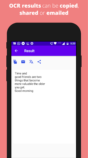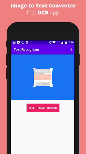 * ekstrak teks bahasa Inggris apa pun dari gambar atau dokumen * Anda juga dapat menggunakan kamera ponsel Untuk memindai teks dari mana saja , Facebook, Google Keep dan aplikasi lain yang memungkinkan berbagi konten teks.