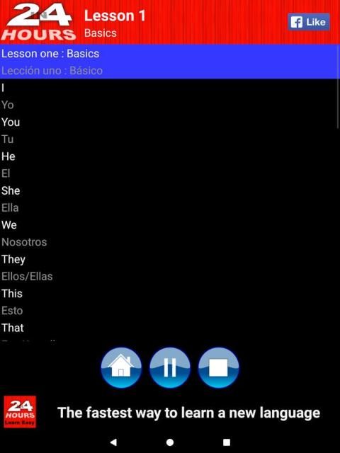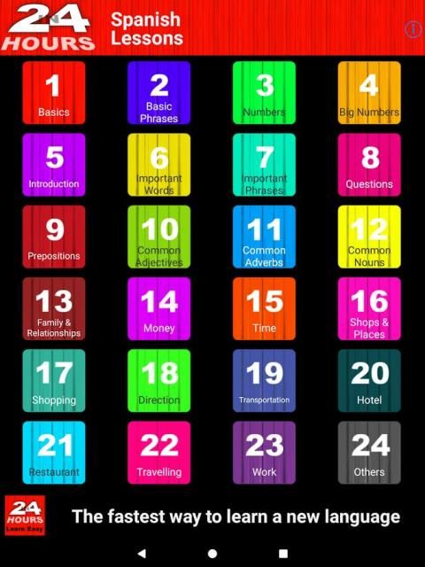 Ini adalah terbaru dan mungkin aplikasi yang paling efektif bagi Anda untuk belajar bagaimana berbicara bahasa Spanyol dalam 24 jam! Aplikasi ini menyediakan siswa, wisatawan, penjelajah atau pengusaha dengan pengalaman belajar audiovisual tentang bagaimana berbicara bahasa Spanyol.