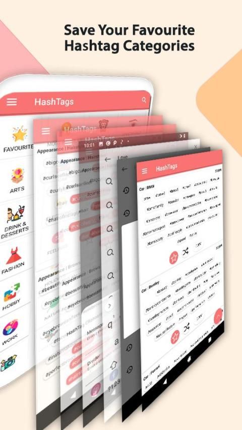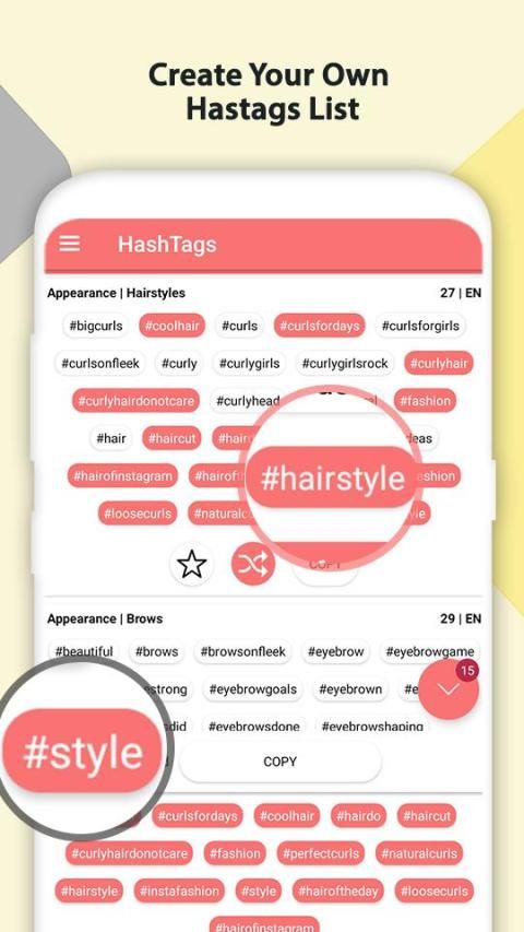 Dalam Hashtags menawarkan Anda tagar yang paling populer dan paling populer yang terkait dengan konten Anda. Di sini Anda dapat dengan mudah memilih, menyalin, dan menempelkan tagar favorit Anda. Aplikasi ini memiliki semua tagar populer, menerapkan pencarian yang nyaman.