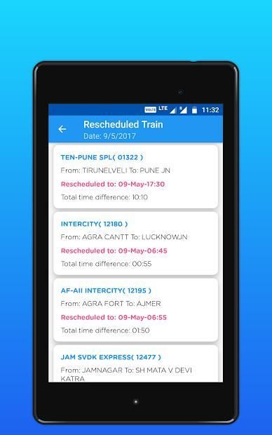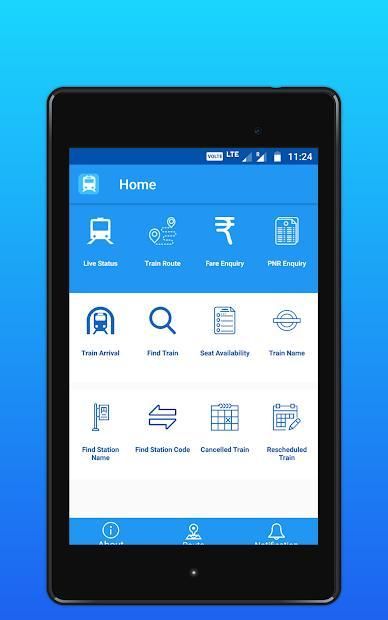 aplikasi Kereta Api India Kirim memungkinkan Status Kereta Api India kereta, status PNR, ketersediaan kursi di kereta, kereta berjalan Status Live, Kereta tabel waktu, penyelidikan Fare, Kereta rute dan Kereta antara stasiun.