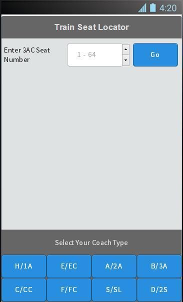 Aplikasi ini membantu penumpang Kereta Api India untuk menemukan posisi duduk dan jenis tempat tidur dari Coach dan Nomor Kursi yang tersedia di Indian Railway Tiket.