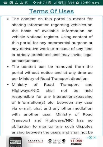 Kementerian Transportasi Jalan dan Jalan Raya / NIC tidak bertanggung jawab atas interaksi / kelulusan informasi, dll. Antara setiap pengguna melalui e-mail, obrolan dan mediasi lainnya dengan pengguna lain. Kementerian Transportasi Jalan dan Jalan Raya / NIC tidak memiliki kewajiban untuk memantau setiap sengketa yang timbul antara pengguna dan tidak akan menjadi pihak dalam sengketa / litigasi seperti itu dll.