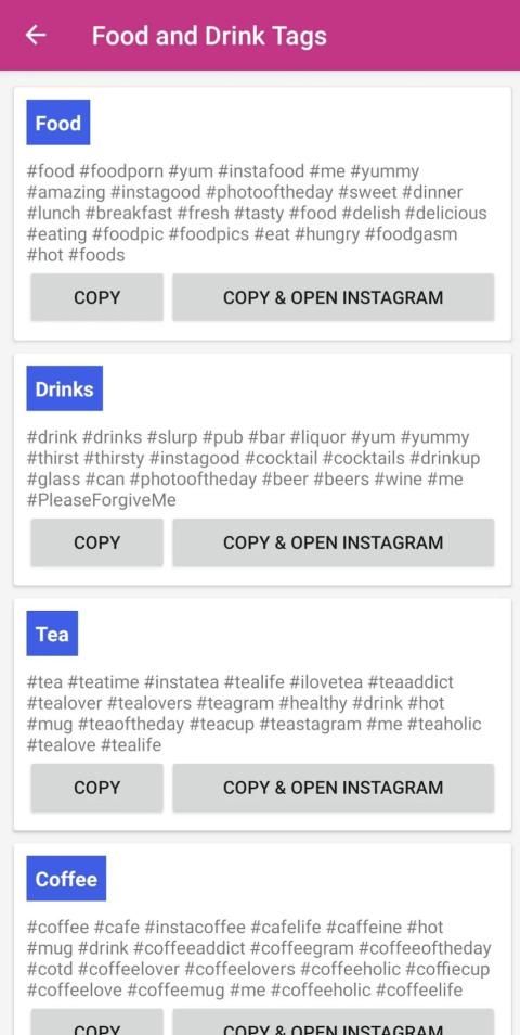 The app is very organized, it gives you over 10 categories, and every category has its own subcategories of hashtags, copy, go directly to Instagram Facebook or Twitter from the app, paste them quickly and get hundreds of thousands organic followers and likes for free.