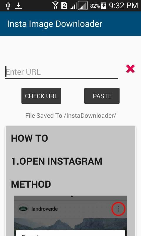 InstaDownloader memungkinkan untuk men-download video dan gambar dari link Instagram. Dengan menyalin link di gambar dan video dan menyisipkan ke InstaDownloader yang secara otomatis mendownload video / gambar.