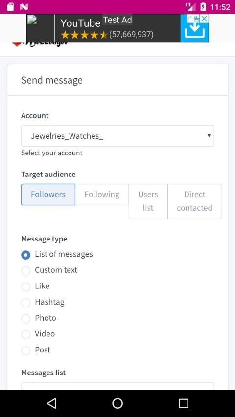 Message type: This is the best section in Instagram Messenger which will help you to select the type of message you wish to send to your customer. Such as you message can be custom text message , or can be just "like" or hashtag or photo or videos or sharing post with some text. This is the section which will give you complete customization of your communication.