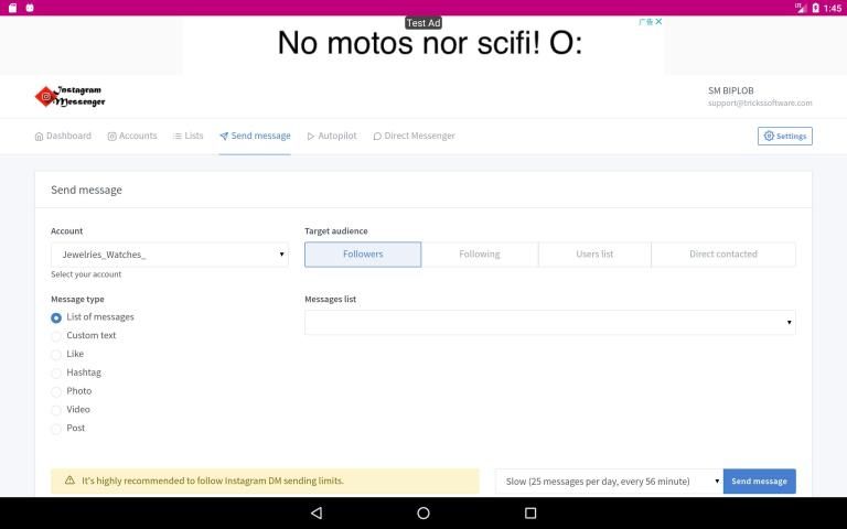 Send Message: This is the most useful section in Instagram Messenger. because you will be able to scale your marketing plan. You will be able to scale number of messages you wish to send per day. Such as , 200 message per day 7 minutes interval. or you can select 25 message per day every 56 minutes interval. So, This is really awesome for the marketers specially for eCommerce business owners.