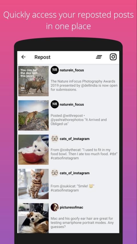 - Repost semua pos publik dari Instagram dengan kredit gambar yang tepat. Aplikasi ini juga menyimpan riwayat semua repost yang Anda buat menggunakannya.