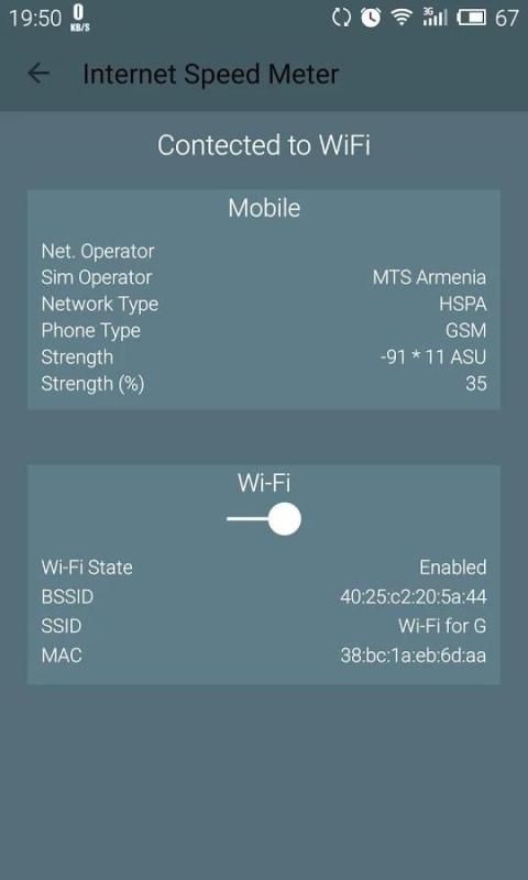 Internet Speed info has external layout which allows to know about internet traffic using applications with their internet speed everywhere. User can see mobile and Wifi data usage with both graphics and list data. There are mobile upload, mobile download, mobile total, WiFi upload, WiFi download and WiFi total usage informations. User can zoom graphics using 2 fingers and to know more about daily usage using graphic method. Application shows information about mobile connection, mobile internet and WiFi internet (e.g mac address, SSID...). User can turn off or turn on WiFi immediately from application. There is live speed activity in application using which user can realtime see internet download and upload curve versus time and below it information about internet using applications. Internet speed meter in status bar and notification bar is shown only when internet is connected. In settings there is also option to show internet speed meter even when internet is disconnected.