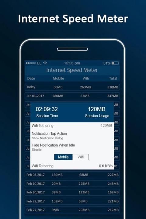 kecepatan internet toko aplikasi meteran harian penggunaan internet mobile dan penggunaan wifi internet setiap hari di data sql dan pengguna dapat melihat penggunaan lalu lintas internet dari 30 hari yang direpresentasikan dalam grafik penggunaan internet dan baris penggunaan internet.