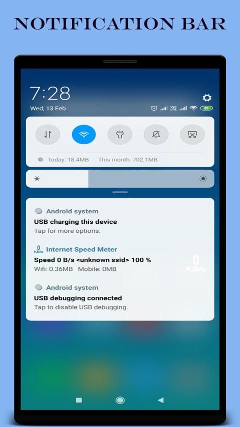 - Speed Mobile Internet and WiFi And Use Of The Current Day As Well As Internet Speed Alerts In The Notification Bar (Notification)