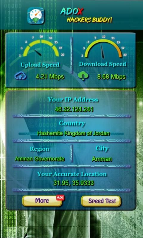 هذا التطبيق يتيح لك فحص سرعة إتصالك في شبكة الانترنت والواي فاي, ويظهر لك رقم الآي بي الخاص بإتصالك, ويوفر ايضا معلومات السيرفر والخادم الموزع وموقعه الاقليمي والجغرافي.