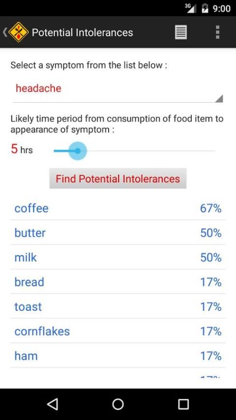 Setelah Anda telah mencatat sejumlah berguna data tentang konsumsi makanan Anda dan gejala, aplikasi ini mampu melakukan analisis statistik informasi ini dan kemudian memberikan indikasi yang makanan mungkin menjadi penyebab paling mungkin dari gejala tertentu Anda mengalami (app mengabaikan catatan yang telah Anda masukkan). Selain itu Anda dapat mencari makanan yang, setelah konsumsi, mungkin baik pendek atau panjang "masa inkubasi" sebelum menyebabkan gejala yang nyata. Hal ini dapat dilakukan dengan menyesuaikan slider sederhana untuk mempengaruhi bagaimana analisis statistik terlihat pada data. Perlu dicatat bahwa informasi yang diberikan dalam aplikasi ini tidak merupakan nasihat medis. Anda harus selalu berkonsultasi dengan profesional medis sebelum memulai setiap tindakan yang dapat mempengaruhi kesehatan Anda.