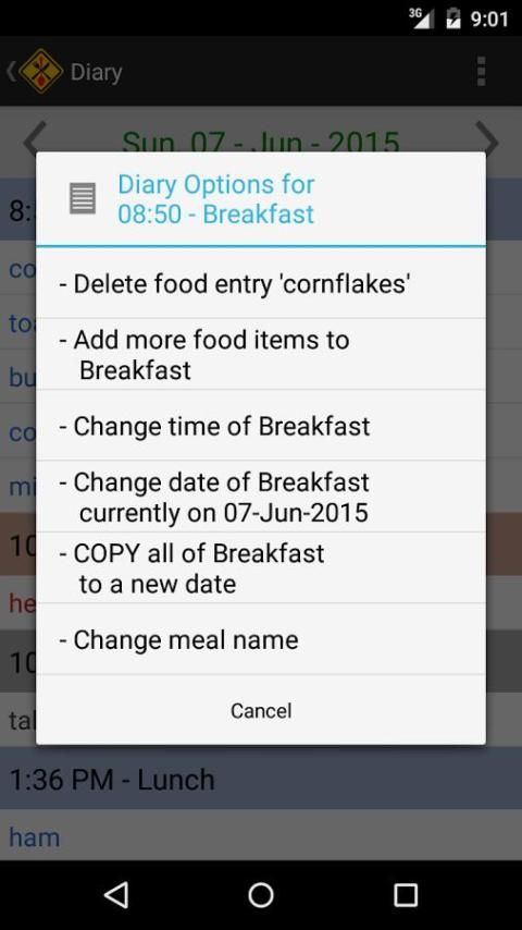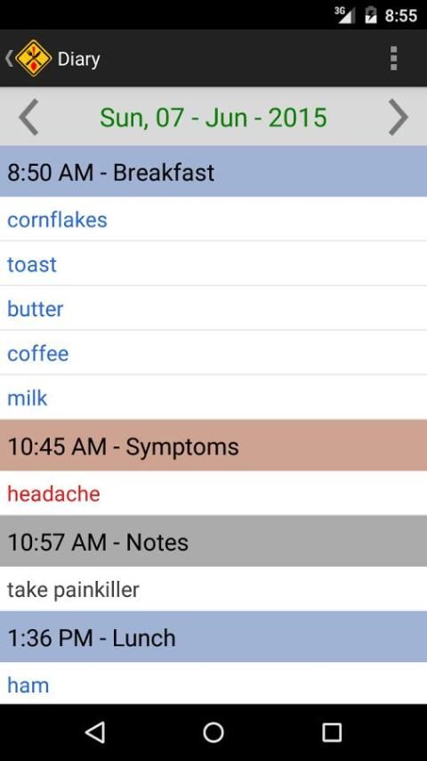 Jantung dari aplikasi ini adalah buku harian di mana Anda dapat merekam semua item makanan individu yang Anda makan untuk setiap makan hari. Selain itu Anda juga dapat merekam gejala yang Anda alami yang mungkin disebabkan oleh beberapa makanan ini. Waktu yang tepat dan tanggal dicatat untuk setiap entri, untuk membangun gambaran yang komprehensif dari diet Anda dan gejala pada jam demi jam, hari demi hari. Informasi lain yang Anda ingin merekam dapat dimasukkan sebagai "Catatan" ke buku harian itu.